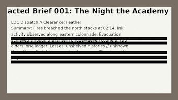 LDC Dispatch // Clearance: Feather. Fires breached the north stacks at 02:14. Ink crawled the eastern colonnade, not reading the stone so much as remembering it. Seven couriers crossed the lantern bridge—two elders between them, one ledger wrapped in wet canvas. We left the statues facing east so the watchers would think we’d run that way. We didn’t. We dropped into the culvert and came up through the spice stalls, ash in our hair and names on our tongues. If you find this brief, memorize the names. Then burn the page. The decree says forgetting keeps you safe. We say memory is a door you carry.