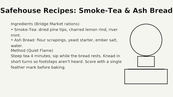The market teaches patience. Tea first, plans second. We brew Smoke-Tea when the air has too much memory in it: pine tips for sharpness, charred lemon rind for the scorch, river mint to cool the mouth enough to talk. Ash Bread is for travel—starter folded into scrapings, ember salt pinched like a blessing. Knead in short turns so the table doesn’t thump; silence carries farther than footsteps. Score the loaf with a single feather mark so even in a hurry you’ll know it’s ours. Share the heel with the quietest person in the room. You’ll need them later.