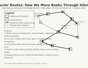We don’t move books. We move pieces of books—signatures, boards, spines—like memories carried in different pockets. Bridge markets rise and vanish overnight, so our routes do the same. A ledger’s cover rides with a baker at dawn. The middle pages cross at noon tucked beneath herb bundles. The spine arrives at dusk inside a crate of lantern glass that no one dares shake. Listening posts hum in plain sight: a gossiping stallholder, a musician stuck on one wrong note, a child selling salt too cheap to be real. If lanterns blink twice and hold, pause under the nearest arch and pretend to count coins. If footsteps sync behind you, adjust your pace by a heartbeat—never faster, never slower. Reassembly happens in the monastery’s lower archive, Room Theta, where stone remembers how to be quiet. When the book is whole again, we read a single line aloud, just to prove we can, and then we hide it better.