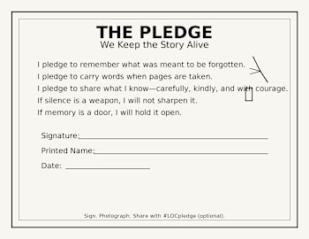 Rebellions begin with logistics; they last because of vows. This one fits in a pocket. Print the Pledge Page, sign it, tuck it into a book you love, and carry it until the paper softens. Read it before you pass a story forward. Read it when the world asks you to look away. If silence is a weapon, we won’t sharpen it. If memory is a door, we’ll hold it open long enough for someone else to step through. If you choose to share, post a photo with #LDCpledge—no faces needed, just your signature and the feather mark. Courage doesn’t need volume; it needs witnesses. Be one.